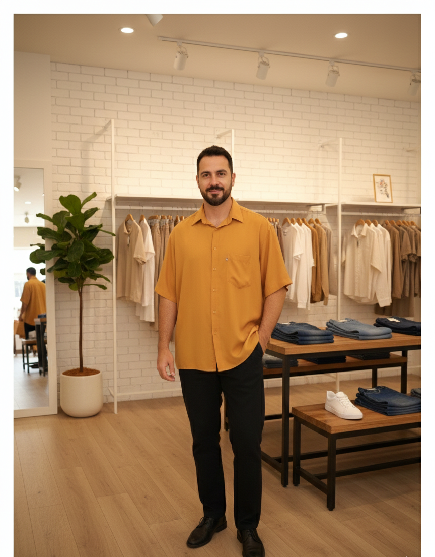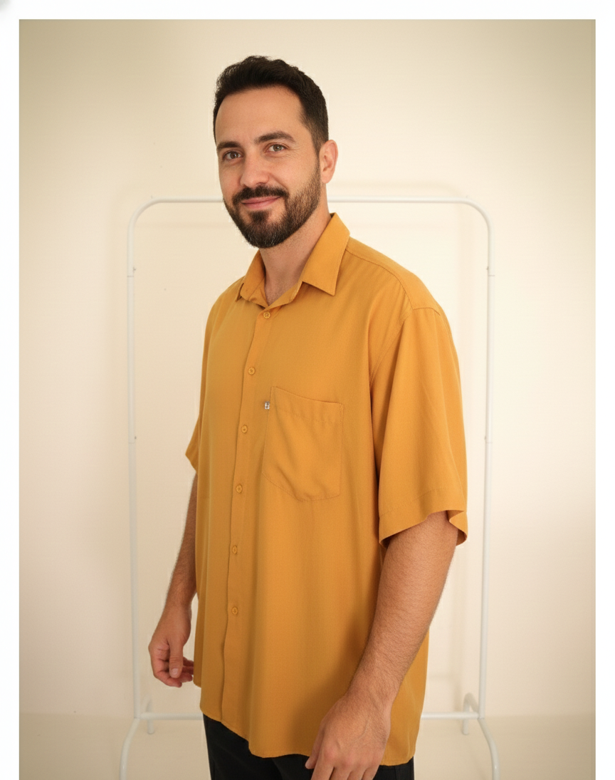 Confeccionada em um blend premium de 64% viscose e 36% poliéster, proporciona conforto e durabilidade. O tecido respirável mantém a sensação de frescor ao longo do dia, sem perder o apelo sofisticado do tom mostarda. Essa cor transmite confiança e acolhimento, tornando-se um destaque em qualquer guarda-roupa.